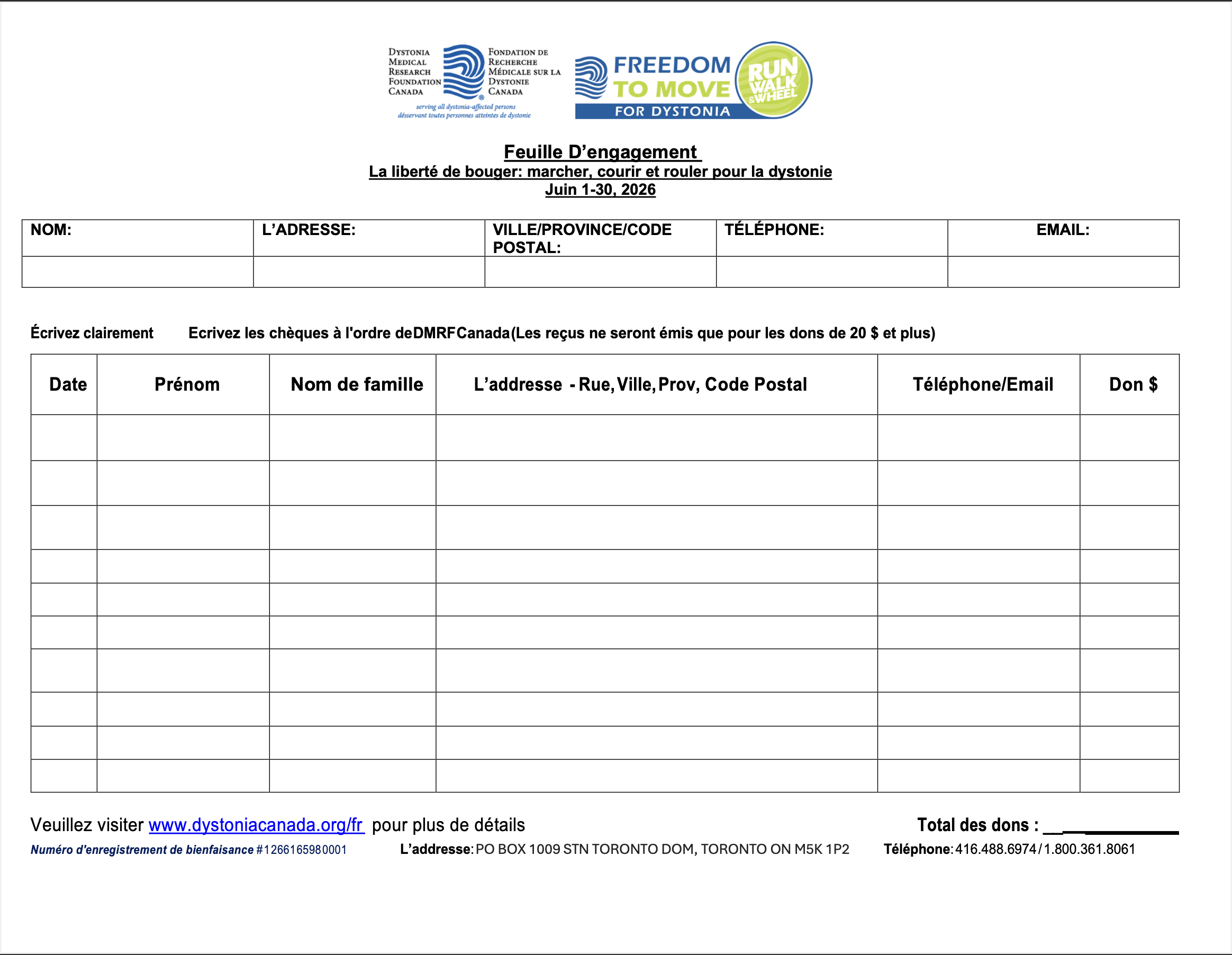 La liberté de bouger : Courir, marcher et rouler pour la dystonie revient en juin 2026! Joignez-vous à la collectivité des personnes atteintes de la dystonie partout au Canada pour accroître la sensibilisation à la dystonie, amasser des fonds et apporter du soutien. La dystonie est un trouble neurologique du mouvement. Se déroulant pendant tout le mois de juin, l'événement Liberté de bouger permettra aux individus de se lever et de bouger, n'importe quand, n'importe où et comme ils le souhaitent tout au long du mois pour soutenir la communauté dystonique. Événement virtuel Quand : Du 1er au 30 juin 2026 Lieu : N'importe où au Canada Prix de préinscription : 10 $/ Adulte; Gratuit pour enfant