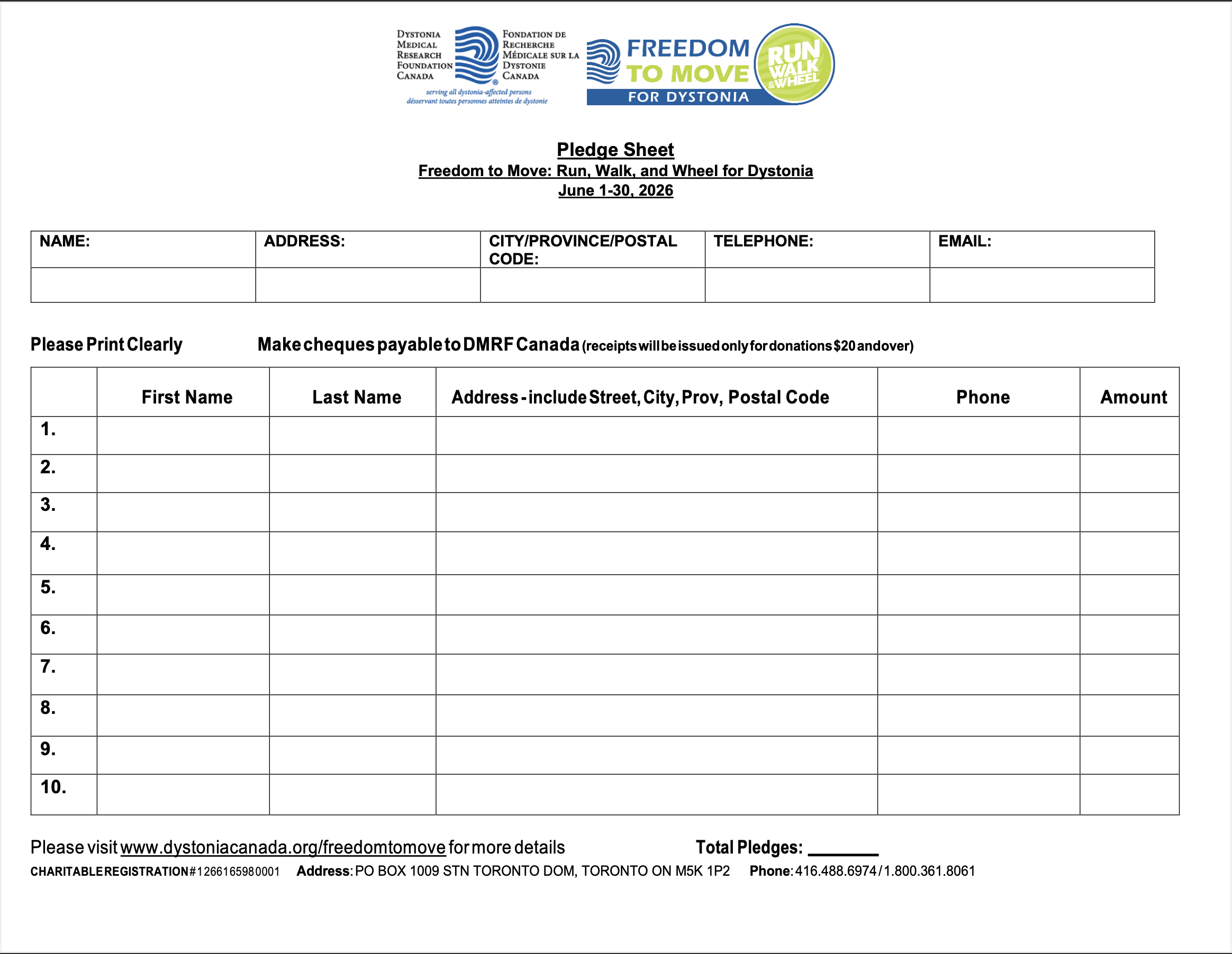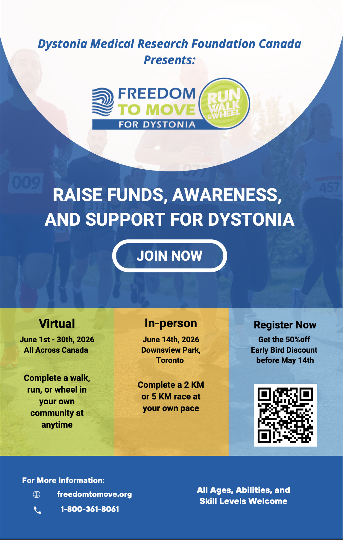 Every June Canadians from coast-to-coast unite to raise awareness and critical funds for dystonia. To date, Freedom to Move has raised over $1 million to fund research, support programs, and advocacy efforts for people living with dystonia. We invite you to join us in a celebration of strength, community, and determination to make a positive impact for those living with dystonia. You can complete a walk, run, or wheel either virtually in your own community or join us in-person.